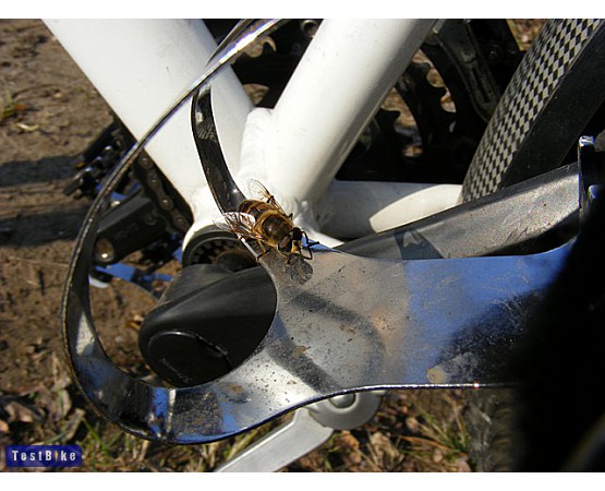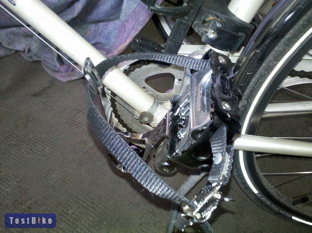 Lényeges az anyaga. Mostanában nagyon jó minőségű, és meglehetősen erős műanyagból is készítenek ilyet, az azonban messze nem ilyen ellenálló és tartós. Egy alkalommal próbálkoztam vele (egyszer talán meg is írom róla a véleményemet), néhány hónap után azonban megadta magát. Ezzel a krómozott acél lábbilincscsel ilyen nemigen fordul elő. Rendkívül rugalmas és alaktartó, és ha mégis kimenne valamelyest a formájából, vissza lehet hajlítani. Nagy ritkán földet ér, barázdát hasít rajta, vagy szikrát vet és némileg lehorzsolódik, ha éppen kőbe akad, de egyébként kutya baja. Az állandó használat a krómozott felületen meglátszik, a rozsda azonban nem harap bele. Úgy látszik, a lemez maga is rozsdamentes, ámbár ebben nem vagyok biztos. Jó minőségű rögzítő csavarok járnak hozzá, és ezek is rozsdamentesek.