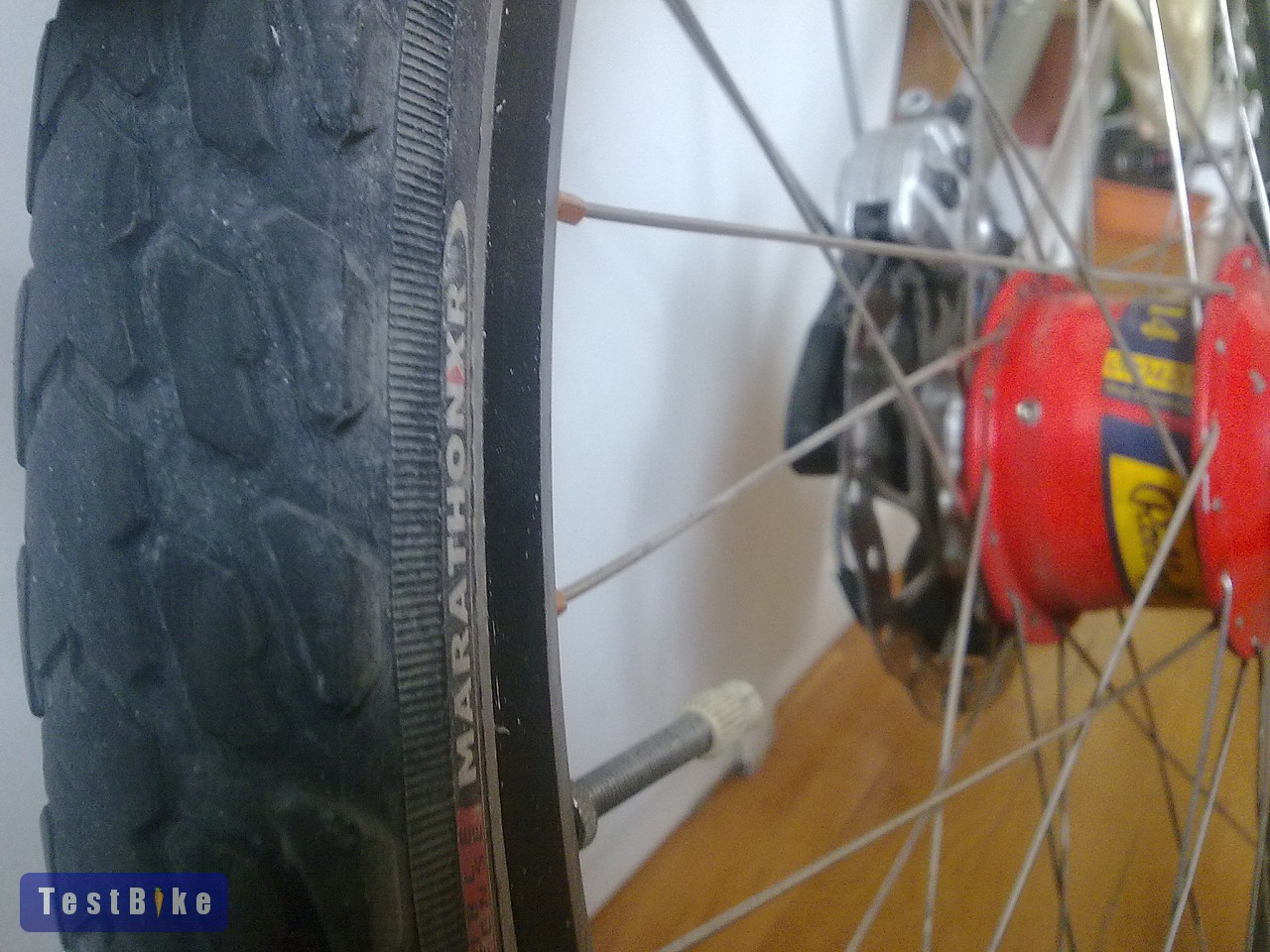 ISZONYAT TARTÓS, közel 18000 km! van benne és még mindig bírja és bírja a Marathon XR. Defektet még NEM kapott! Az oldalsó bütyköknek köszönhetően a kanyarsebessége brutális, mivel a bringát jól be lehet dönteni vele. A 2006-os modellt használom (26x2), amely egy komoly előrelépés a 2002-es modellhez képest. Az a tény hogy egy 17mm-es belső szélességű felniben közel 5 bar-on használva is ennyire bírja mindent elárul. Nem tartozom a legnehezebb bringások közé a magam 80-82 kg-jával, de így is bátran merem ajánlani azoknak akik sokat túráznak. Mindkét keréken egyaránt kiválóan használható. Esőben óvatosan kell vele bánni, mert hajlamos csúszkálni. Száraz időben jól fékezhető így bátran le merek vele gurulni a hegyi utakon 50-nél nagyobb tempóban (akár kanyarban jól bedöntve is).